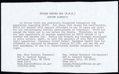 PRISON REFORM NOW (P.R.N.) ACTION ALERT!!! An Action Alert was previously dispersed throughout the population regarding S8129. For those that missed the notification, S8129 (if passed) will require offenders to pay 50 cents per visit...