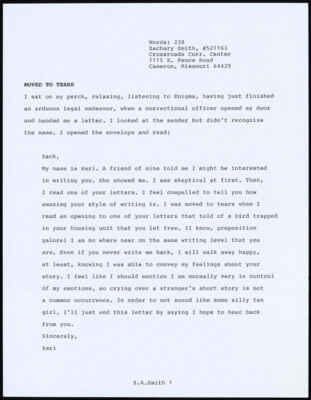 Words: 238 Zachary Smith, #521163 Crossroads Corr. Center 1115 E. Pence Road Cameron, Missouri 64429 MOVED TO TEARS I sat on my perch, relaxing, listening to Enigma, having just finished an arduous legal endeavor, when...