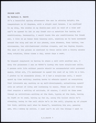 PRISON LIFE By Zachary A. Smith It's a beautiful spring afternoon: the sun is shining bright; the temperature is 63 degrees, with a slight cool breeze. I am confined to my wing. The window in...