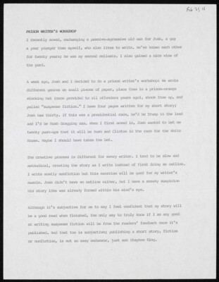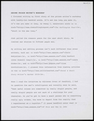 PRISON WRITER'S WORKSHOP I recently moved, exchanging a passive-aggressive old man for Josh, a guy a year younger than myself, who also likes to write. We've known each other for twenty years; he was my...