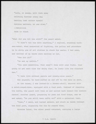 "Life, it seems, will fade away Drifting further every day Getting lost within myself Nothing matters, no one else. --Metallica Fade to Black "What did you hit him with?" the guard asked. "I didn t...
