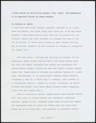 A Book Review of Writing My wrongs: Life, Death, and Redemption in an American Prison by Shaka Senghor by Zachary A. Smith I read this book after another prisoner received it as a gift from...