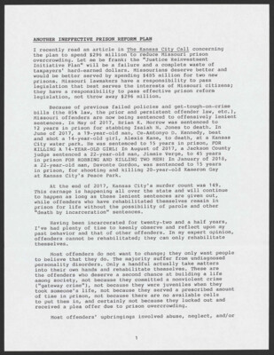 ANOTHER INEFFECTIVE PRISON REFORM PLAN I recently read an article in The Kansas City Call concerning the plan to spend $296 million to reduce Missouri prison overcrowding. Let me be frank: the "Justice Reinvestment Initiative...