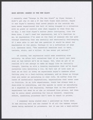 BOOK REVIEW: ORANGE IS THE NEW BLACK I recently read "Orange Is The New Black" by Piper Kerman. I didn't get why it was a #1 New York Times best-seller. Maybe it was Piper's honesty...