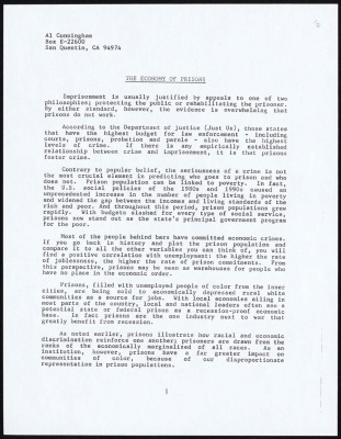 Al Cunningham Box E-22600 San Quentin, CA 94974 THE ECONOMY OF PRISONS Imprisonment is usually justified by appeals to one of two philosophies; protecting the public or rehabilitating the prisoner. By either standard, however, the...