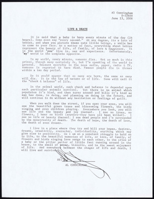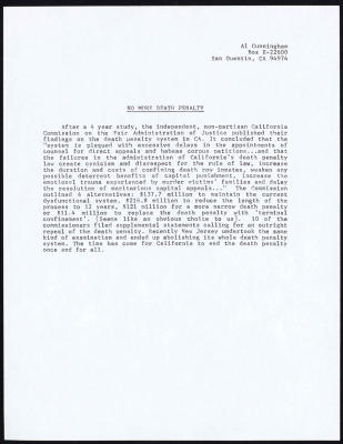 Al Cunningham Box E—22600 San Quentin, CA 94974 NO MORE DEATH PENALTY After a A year study, the independent, non-partisan California Commission on the Fair Administration of Justice published their findings on the death penalty...