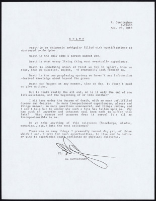 A1 Cunningham E-22600 Oct. 29, 2010 D E A T W Death is an enigmatic ambiguity filled with mystifications to abstrused to decipher. Death is the only game a person cannot win. Death is what...