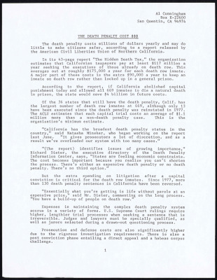 Al Cunningham Box E—22600 San Quentin, CA 94974 THE DEATH PENALTY COST $$$ The death penalty costs millions of dollars yearly and may do little to make citizens safer, according to a report released by...