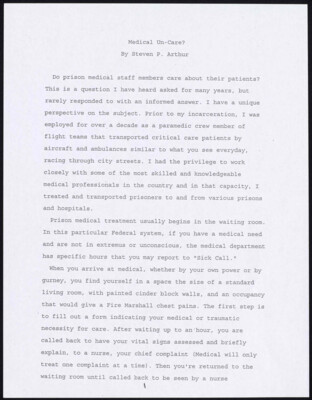 Medical Un-Care? By Steven P. Arthur Do prison medical staff members care about their patients? This is a question I have heard asked for many years, but rarely responded to with an informed answer. I...