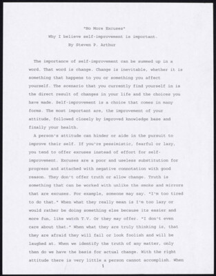 "No More Excuses" Why I believe self—improvement is important. By Steven P. Arthur The importance of self—improvement can be summed up in a word. That word is change. Change is inevitable, whether it is something...