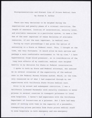 Misrepresentations and Blatant Lies of Prison Medical Care By Steven P. Arthur There are many decisions to be weighed during the negotiations and penalty phase of a criminal conviction. The length of sentence, location of...