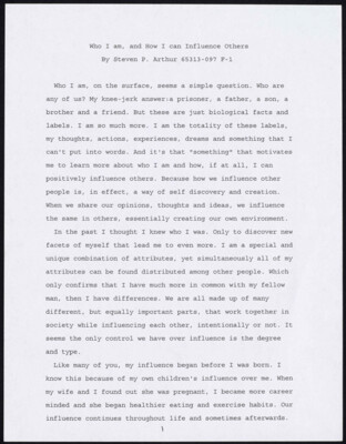 Who I am, and How I can Influence Others By Steven P. Arthur 65313-097 F—l Who I am, on the surface, seems a simple question. Who are any of us? My knee-jerk answer:a prisoner, a...