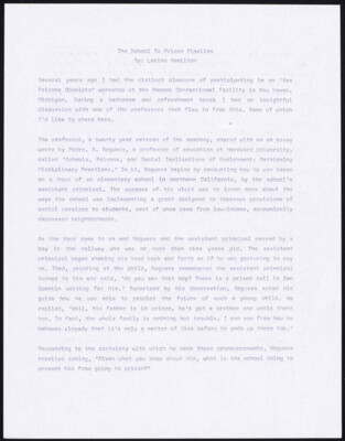 Ths School To Prison Pipeline By: Lacinq Hamilton Several years ago I hap the. distinct pleasure.. of participating in an "Are Prisons.Qbsolets" workshop at the Macomb Correctional.Pacility in New Hav Michigan. During a bathroom and...