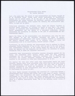 #Incarcerated Lives Matter By: Lacino Hamilton Just a few years ago, the crises of mass incarceration was largely thought of as an invisible issue. Talked about almost exclusively in abolitionist circles and on prison yards....