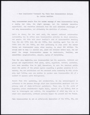 A More Complicated Framework May Yield More Decarceration Options By: Lacino Hamilton Many incarcerated people find the sudden message of mass incarceration being a really bad idea, the right message, but the dominate narrative superficial....