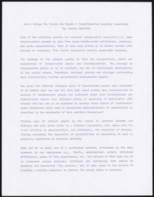Let s Bridge The Divide And Create A Transformative Learning Experience By: Lacino Hamilton Much of the criticism pushing the national conversation concerning U.S. mass incarceration appears to come from upper-middle-class politicians, scholars, and media...