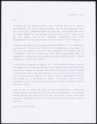 February 2, 2011 Dad, No matter how many times, how many ways, I explain the past 37 years of nonfulfillment, you seem to never understand. You did not understand whan I was fifteen when I...