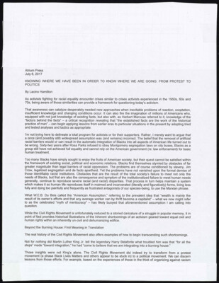 Atrium Press July 6, 2017 KNOWING WHERE WE HAVE BEEN IN ORDER TO KNOW WHERE WE ARE GOING: FROM PROTEST TO POLITICS By Lacino Hamilton As activists fighting for racial equality encounter crises similar to...