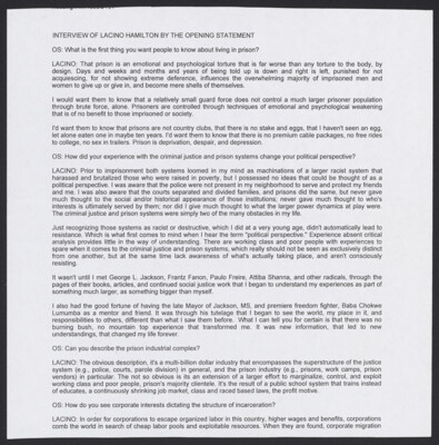 INTERVIEW OF LACINO HAMILTON BY THE OPENING STATEMENT OS: What is the first thing you want people to know about living in prison? LACINO: That prison is an emotional and psychological torture that is far...