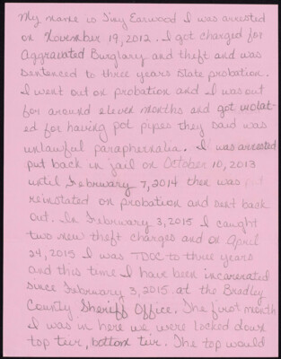 Tiny Earwood Tennessee [NO TITLE] My name is Tiny Earwood I was arrested on November 19, 2012. I got charged for Aggravated Burglary and theft and was sentenced to three years state probation. I went...