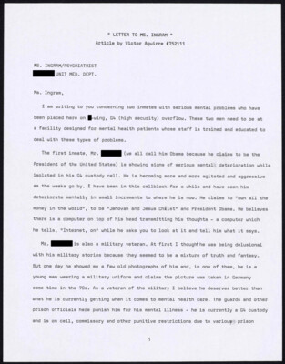 "LETTER TO MS. INGRAM" Article by Victor Aguirre MS. INGRAM/PSYCHIATRIST [redacted] UNIT MED. DEPT. Ms. Ingram, I am writing to you concerning two inmates with serious mental problems who have been placed here on [redacted]-wing,...