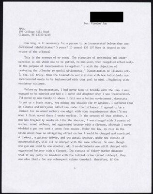 Pen: Freedom Sun APWA 198 College Hill Road Clinton, NY 13323-1218 How long is it necessary for a person to be incarcerated before they are considered rehabilitated? 5 years? 10 years? 15? 20? Does it...