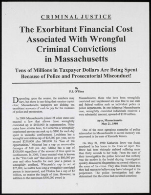 CRIMINAL JUSTICE The Exorbitant Financial Cost Associated With Wrongful Criminal Convictions in Massachusetts Tens of Millions in TaxpayerDollars Are Being Spent Because of Police and Prosecutorial Misconduct! By P.J. O’Shea Depending upon the source, the...