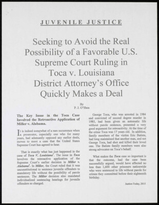.3 U E N I L E J U S T I C E eal ossiility of a avo US. Toca V. Louisiana P. I. O’Shea The Key Issue in the Toca. Case Involved the...