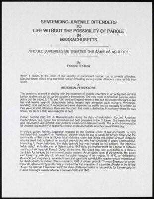 Sentencing Juvenile Offenders to Life Without the Possibility of Parole in Massachusetts Should Juveniles Be Treated the Same as Adults? By Patrick O'Shea
