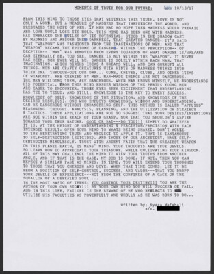 10/13/17 MOMENTS OF TRUTH FOR OUR FUTURE: FROM THIS MIND TO THOSE EYES THAT WITTNESS THIS TRUTH. LOVE IS NOT ONLY A WORD, BUT A MEASURE OF MADNESS THAT INFLUENCES THE WORLD, AND PRESUADES THE...
