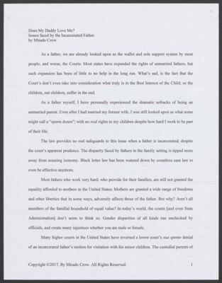 Does My Daddy Love Me? Issues faced by the Incarcerated Father. by Mirado Crow As a father, we are already looked upon as the wallet and sole support system by most people; and worse, the...
