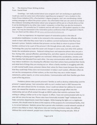 To: The America Prison Writing Archive From: Daniel Pirkel Greetings. I am really excited about your program and I am enclosing an application. Could you send me some more information regarding your program? I am...