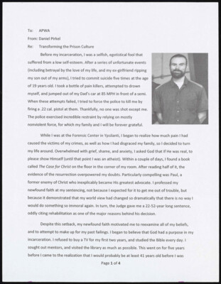 To: APWA From: Daniel Pirkel Re: Transforming the Prison Culture Before my incarceration, l was a selfish, egotistical fool that suffered from a low self-esteem. After a series of unfortunate events (including betrayal by the...