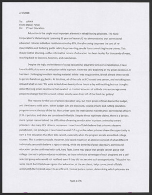 To: APWA From: Daniel Pirkel Re: Prison Education