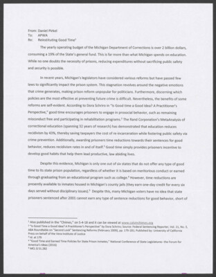 From: Daniel Pirkel To: APWA Re: Reinstituting Good Time1 The yearly operating budget of the Michigan Department of Corrections is over 2 billion dollars, consuming a 19% of the State's genera! fund. This is far...