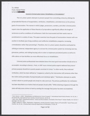 To: APWA From: Daniel Pirkel 5/13/18 America's Criminal Justice System: Rehabilitation or Criminalization? The US, prison system attempts to prevent people from committing crimes by utilizing the jurisprudential theories of incapacitation, retribution, rehabilitation, and deterrence...