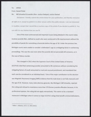 To: APWA From: Daniel Pirkel Re: Bill Schuette & Juvenile Lifers - Justice Delayed, Justice Denied Disclaimer: I hereby submit the article below for your publication, and thereby renounce all rights to it, except to...
