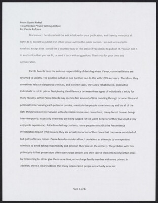 From: Daniel Pirkel To: American Prison Writing Archive Re: Parole Reform Disclaimer: I hereby submit the article below for your publication, and thereby renounce all rights to it except it publish it in other venues...