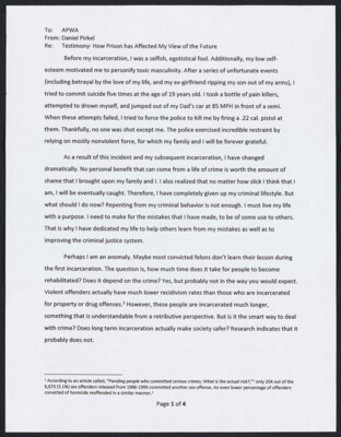 To: APWA From: Daniel Pirkel Re: Testimony— How Prison has Affected My View of the Future Before my incarceration, I was a selfish, egotistical fool. Additionally, my low self- esteem motivated me to personify toxic...