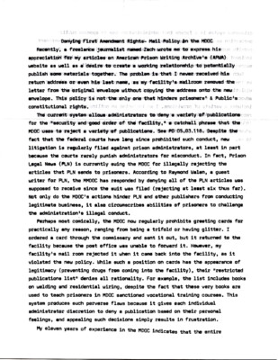 Denying First Amendment Rights- Mail Policy in the MDOC Recently, a freelance journalist named Zach wrote me to express his appreciation for my articles on American Prison Writing Archive's (APWA) website as well as a...