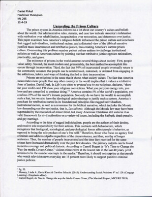 Daniel Pirkel Professor Thompson ML 295 12-4-19 Unraveling the Prison Culture The prison system in America informs us a lot about our country's values and beliefs about the world. Our administrative rules, statutes, and case...