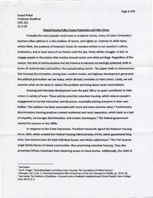 Page 1 of 8 Daniel Pirkel Professor Bradford CMS 251 11-3-19 Flawed Housing Policy Creates Polarization and Hate Crimes Probably the most popular social topic in academic circles, many of Calvin University's teachers often address...
