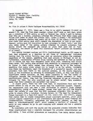 Daniel Pirkel Richard A. Handlon Corr. Facility 1728 W. Bluewater Highway Ionia, Mi. 48846 APWA Re: Fire in prison & State Employee Accountability Act (SEAA) On December 27, 2019, there was a fire in my...