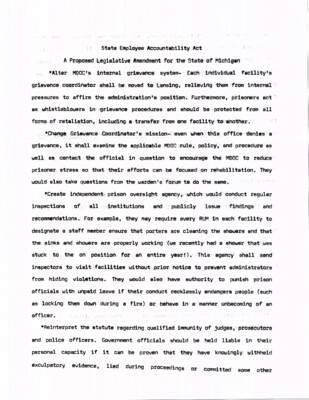 State Employee Accountability Act A Proposed Legislative Amendment for the State of Michigan *Alter MDOC's internal grievance system- Each individual facility's grievance coordinator shall be moved to Lansing, relieving them from internal pressures to affirm...