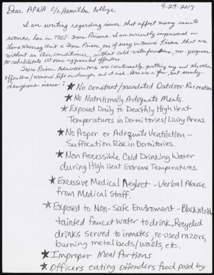 9-29-2017 Dear APWA c/o Hamilton College I am writing regarding issues that affect many inmate women here in TDCJ-Texas Prisons. I am currently imprisoned in Lane Murray unit a Texas Prison, one of many womens'...