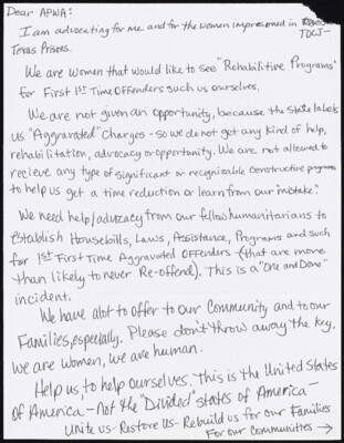 No Title Dear APWA: I am advocating for me and the women imprisoned in TDCJ-Texas Prisons. We are women that would like to see "Rehabilitative Programs" for first 1st time offenders such as ourselves. We...