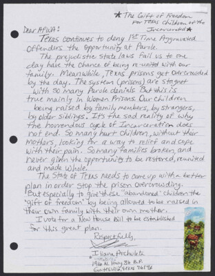 The Gift of Freedom for Texas children of the Incarcerated Dear APWA: Texas continues to deny 1st time aggravated offenders the opportunity at parole. The prejudistic state laws fail us to one day have the...