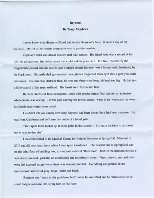 Reynoso By Tracy Meadows I never knew what disease stiffened and wasted Reynoso's body. It wasn't any of my business. My job as his irunate companion was to get him outside. Reynoso's head was shaved...