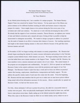 The Inmate Reentry Support Team Inmates helping inmates become Returning Citizens By Tracy Meadows In my federal prison housing unit, I am a member of a unique program. The Inmate Reentry Support Team was conceived...