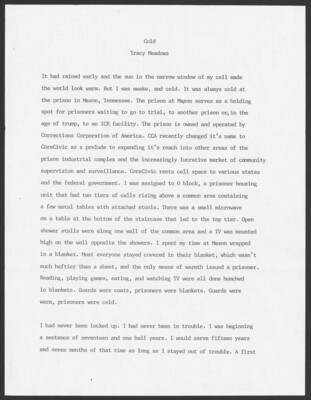 Cold Tracy Meadows It had rained early and the sun in the narrow window of my cell made the world look warm. But I was awake, and cold. It was always cold at the prison...